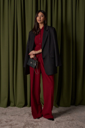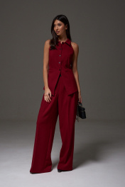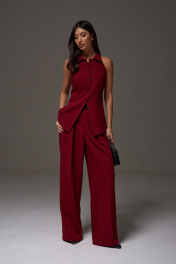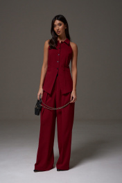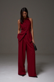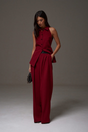 Брюки прямого кроя выполнены из ткани бордового цвета.Характеристики: прямой крой, эластичная брендированная резинка, боковые карманы, на передней и задней частях брюк застрочены складки и заутюжены стрелки. Длина брюк 112 см
