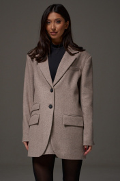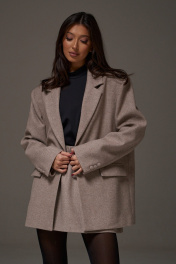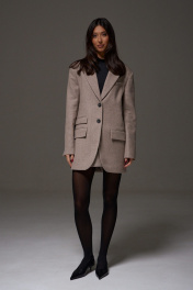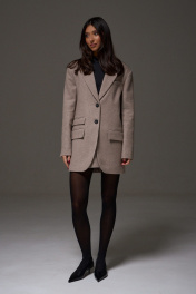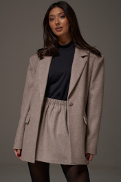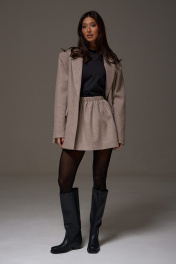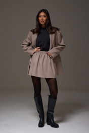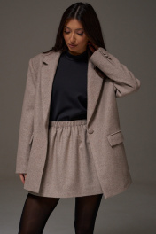 Юбка-мини свободного кроя. Выполнена из шерстяной (смесовой) ткани бежевого цвета. С подкладкой. Пояс на резинке. Застёжки в изделии нет. Длина 41 см