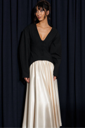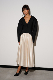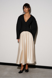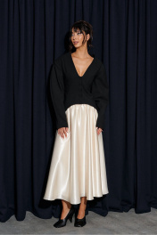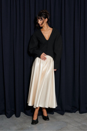 Юбка кроя полусолнце, выполнена из ткани молочного цвета. Характеристики: крой полусолнце, подкладка, по бокам и сзади изделия шов, пояс на резинке со сборкой. Длина юбки 93 см.