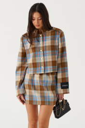 Юбка свободного кроя. Выполнена из костюмной ткани в клетку (цвета голубой, бежевый, коричневый). С подкладкой. Пояс на резинке. Застёжки в изделии нет. Длина бокового шва 41 см