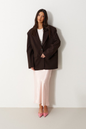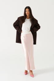 Юбка женская, длинная, покроена по косой. Выполнена из тонкого атласа в розовом оттенке. Характеристика: юбка на подкладке. Пояс цельнокроеный присборен на резинку. Низ обработан в подгибку с открытым срезом. Длина юбки 100 см.