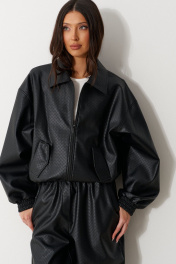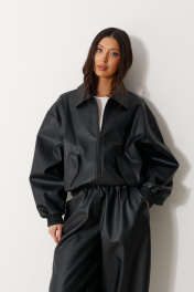 Брюки прямого кроя, выполнены из фактурной эко-кожи черного цвета. Характеристика: прямой крой, пояс на резинке, спереди есть имитация гульфика, без подкладки, в боковых швах карманы. Длина изделия по боковому шву 96 см.