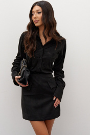 Блузка прямого кроя выполнена из мягкого полотна искусственной замши черного цвета. Характеристики: прямой крой слегка расширяющийся к низу, отложной воротник, застежка центральная на петли пуговицы, карманы по передней части изделия, втачной рукав, по низу рукава манжета на пуговицах, спинка отрезная с двумя рельефами, идущими из-под кокетки до низа, низ изделия с плавным срезом. Длина по спинке от края горловины 71 см, длина рукава от края горловины 80 см.