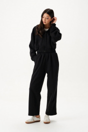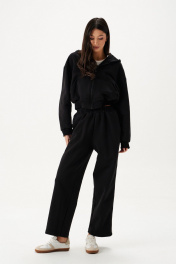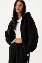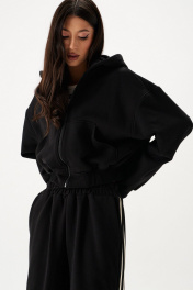 Джемпер. Выполнен из трикотажного полотна чёрного цвета. Рукав втачной, спущен, манжета из довяза. Капюшон двойной, с центральной вставкой. Накладные карманы "кенгуру". Застёжка центральная - молния. Пояс из довяза. Длина рукава от линии втачивания 53 см. Длина спинки 47 см.
