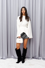 Джемпер свободного кроя. Выполнен из трикотажного полотна молочного цвета. Круглая горловина. Рукав спущенный, втачной, свободный. По линии талии отрез на резинке, от отреза фигурная баска. Длина рукава от линии втачивания 56 см. Длина центра спинки 61 см