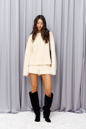 Джемпер прямого свободного кроя. Выполнен из мягкой фактурной ткани цвета айвори. Горловина овальная. Рукав втачной, спущенный. Длина спинки от края горловины 50 см (замер выполняется по центру горловины), длина рукава от линии втачивания 47 см (от горловины 67 см). Образ дополнят шорты А1383