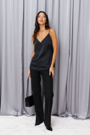 Топ прямого кроя выполнен из сатина темно-синего цвета. Характеристики: прямой крой, вытачки по груди, тонкие бретели с регулировкой, в зоне декольте V-образный вырез. Длина изделия по боковому шву 40см.
