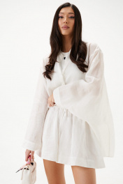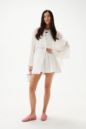 Рубашка свободного кроя выполнена из натурального полотна. Характеристики: рубашка прямого свободного кроя, горловина стойка. Застежка центральная на петли пуговицы, рукав акцентный объёмный, крой рукава «летучая мышь» , спинка отрезная с декоративной сборкой. Длина по спинке 80 см, длина рукава от горловины 76 см.