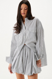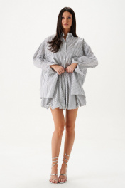 Блузка прямого свободного кроя в полоску. Характеристики: прямой свободный крой, воротник рубашечного типа, застежка центральная на петли пуговички, рукав спущен, по низу рукава широкая манжета на декоративной пуговице, по переду крупные карманы, низ с плавным срезом, внизу по бокам разрезы 18см. Спинка отрезная с декоративной сборкой, длина по спинке 76см, длина рукава от края горловины 83см.