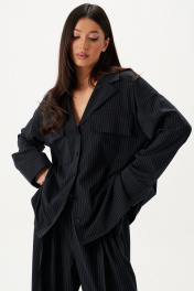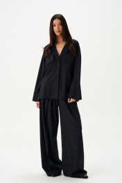 Блузка прямого свободного кроя выполнена из хлопка темно-синего цвета. Характеристики: Прямой крой, воротник пиджачного типа, функциональные накладные карманы по переду изделия, разрезы в боковых швах. Рукав втачной, немного спущен, по низу рукава широкий манжет. Длина по спинке 69 см, длина рукава от горловины 76 см