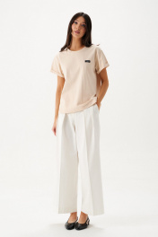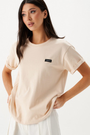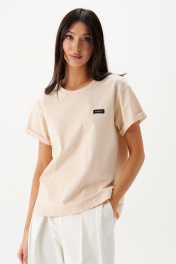 Футболка прямого кроя, выполнена из плотна бежевого цвета.Характеристики: прямой крой, овальный вырез горловины, горловина выполнена из довяза, рукав слегка спущен, край рукава подвернут, спереди пришит фирменный лого. Длина по спинке от края горловины 59 см, длина рукава от края горловины 27 см.
