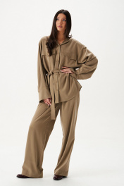 Рубашка прямого свободного кроя, выполнена из текстильного полотна цвета хаки. Характеристика: двойной капюшон, застёжка центральная на пуговицы, по переду на уровне линии груди функциональные карманы с клапаном, рукав свободный спущенный с широкой манжетой на 2 пуговицы, на поясе. Длина рукава 60 см. Длина спинки от края горловины 75 см.
