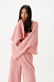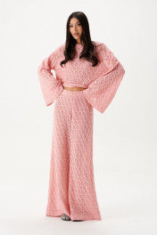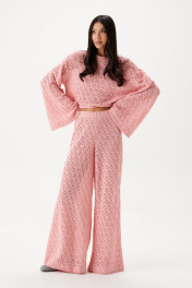 Джемпер свободного прямого кроя выполнен из трикотажного полотна узорной вязки, розового цвета. Характеристики: прямой крой, спушенный широкий рукав, горловина овальная. Длина по спинке 50 см, длина рукава от края горловины 53 см.