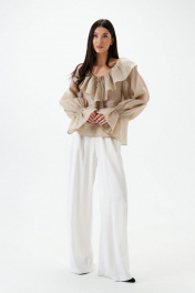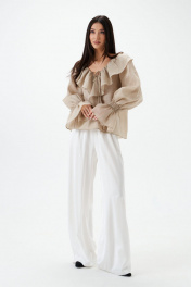Блуза прямого кроя с крупным воротников выполнена из полотна бежевого цвета.Характеристики: прямой крой, V образный вырез горловины, по периметру горловины и по спинке крупный воротник выполнен из ткани основного изделия, рукав втачной, в области запястья по рукаву широкая венгерка, спинка цельнокроеная. Длина по спинке 56, длина рукава 71 см.