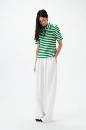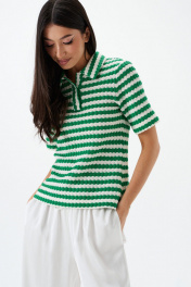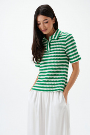 Джемпер-поло. Выполнен из мягкого вязаного трикотажа. Прямой крой. Отложной воротник. Застёжка – пуговички. Рукав втачной. Длина рукава 25 см. Длина спинки 54 см