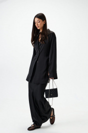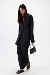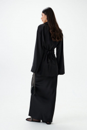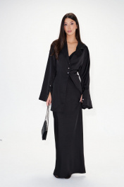 Блузка приталенного силуэта. Выполнена из мягкой струящейся ткани. Воротник жакетного типа , отложной с лацканами.Рукав втачной, с манжетой. Манжета с разрезом, застегивается по передней части рукава.В боковых швах на уровне талии пояс-завязка.Низ прямой с разрезами по боковым швам. Застежка центральная пуговицы. Длина рукава 60 см. Длина спинки 80 см