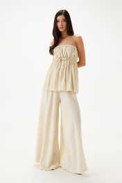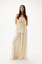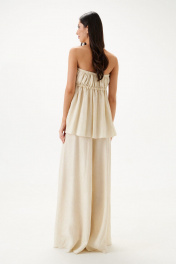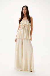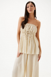 Блуза полуприлегающего силуэта. Выполнена из льняной (смесовой) ткани. Без рукавов, с открытыми плечами. Верх блузы на резинке. Верхняя часть лифа отрезная. По шву стачивания с нижней частью кулиса, в которую втянут шнур-завязка. Длина спинки 49 см
