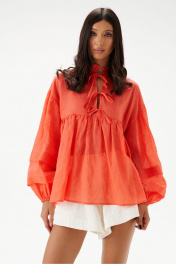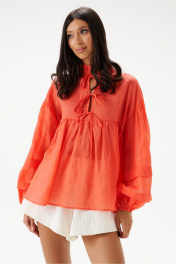 Блуза свободного кроя. Выполнена из легкого натурального полотна- рами . По переду и по задней части фигурная кокетка. По переду на кокетке тесьма-завязки (завязки функциональные). Рукав втачной, немного спущен. Низ рукава на резинкей. Длина по спинке 63 см, длина рукава 52 см.