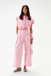 Блузка укороченная, без рукавов, выполнена из хлопкового полотна нежно-розового цвета. Характеристики: воротник рубашечного типа, застежка на пуговицы, по переду накладные карманы с клапонами, низ присборен на резинку. В комплект прилагается шарф из основной ткани изделия. Длинна по спинке 46 см.