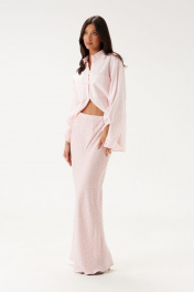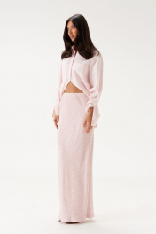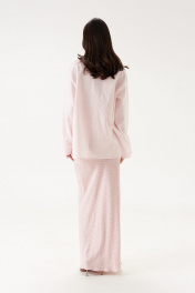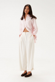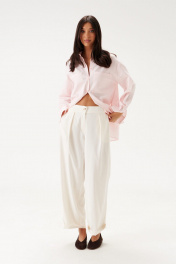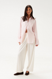 Рубашка свободного кроя. Выполнена из льняного полотна нежно-розового цвета, прямой крой, горловина круглая с отложным воротником на стойке, рукав втачной, немного спущен, с манжетой с пуговичками. В боковых швах разрезы 27 см. Длина рукава от края горловины 71 см. Длина спинки 70 см