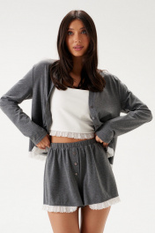 Топ прилегающего силуэта, выполнен из белого трикотажного полотна. Характеристика: прилегающий силуэт, дублированная ткань, по низу топа нишито кружево. Длина от верха шлейки 41см