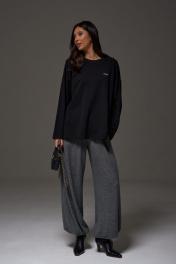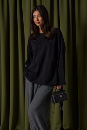 Джемпер прямого свободного кроя,выполнен из трикотажного полотна черного цвета. Характеристики: прямой крой, овальный вырез горловины, спинка цельнокроеная, по переду брендированная нашивка. Рукав длинный спущен. Длина по спинке 73 см, длина рукава от края горловины 53см.