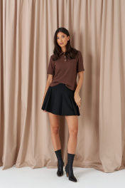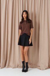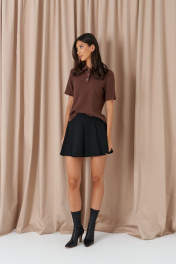 Джемпер-поло прямого кроя. Выполнен из фактурного трикотажа шоколадного цвета. Воротник отложной. Застёжка пуговички на планке. Рукав втачной, короткий. Длина спинки 54 см. Длина рукава от линии втачивания 21 см
