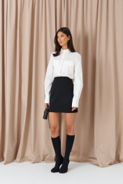Рубашка полуприлегающего силуэта, выполнена ткани белого цвета. Воротник отложной. Рукав втачной, с манжетой с пуговицами. Застёжка центральная - пуговицы. По переду на уровне груди накладные карманы с фигурным клапаном. Длина спинки 65,5 см. Длина рукава от линии втачивания 67 см