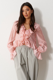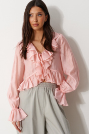 Блузка из полотна розового цвета. Характеристика: свободное облегание, укороченная, горловина V-образная, с притачной рюшей по всей длине горловины, борта и низа, застежка на шнурки-завязки, рукав втачной одношовный, притачной манжетой в виде волана. Длина рукава от края головины 79 см. Длина по спинке 51 см.