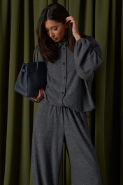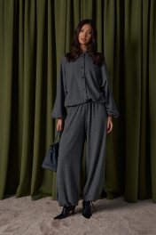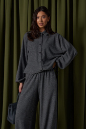 Джемпер прямого кроя, выполнен из трикотажного ворсистого полотна серого цвета. Характеристика: прямой крой, воротник стойка, застежка центральная планка на петли-пуговицы, по низу изделие собирается на резинку с фиксаторами, рукав втачной на резинке, немного спущен. Длина рукава от края горловины 75 см, длина изделия по спинке 65 см.