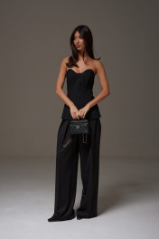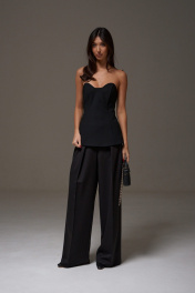 Блузон с фигурным вырезом выполнен из костюмного полотна черного цвета. Характеристики: прилегающий силуэт, подкладка, фигурный вырез горловины, по передней части изделия и в боковых швах упругие узкие пластины, по заднему полотну в среднем шве потайная молния. Длина по центру спинки 41см.