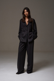 Рубашка свободного кроя. Выполнена из плотной текстильной ткани чёрного цвета. Воротник отложной, пиджачного типа, с лацканами. Рукав втачной, спущенный, с широкой манжетой. По переду на уровне груди накладные карманы. В средних швах рубашки разрезы (19 см). Застёжка центральная - пуговицы. Длина рукава от линии втачивания 55 см. Длина спинки 67 см