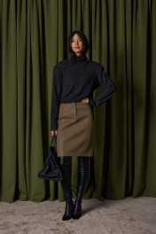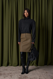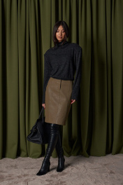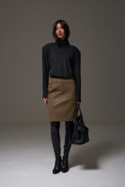 Джемпер укороченный прямого свободного кроя. Выполнен из мягкого трикотажа тёмно-серого цвета. Горловина-стойка, в естественную складку. Есть подплечники (съёмные). Длина рукава от линии втачивания 61 см. Длина спинки 50 см