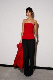 Корсет прилегающего силуэта из костюмной ткани красного цвета. Характеристики: прилегающий силуэт, брендированная подкладка, прямой вырез горловины, по передней и задней части изделия прошиты строчки, по заднему полотну в среднем шве потайная молния. Длина по центру спинки 37,5см, длина по боковому шву 39см.
