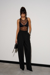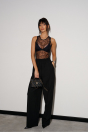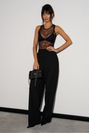 Боди прилегающего силуэта, выполнено из кружевного полотна черного цвета.Характеристики: прилегающий силуэт, по низу застежки на две кнопки. Длина от верхнего края плеча до низа 55 см.