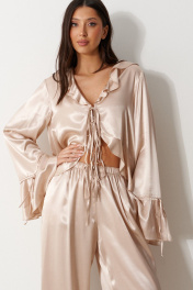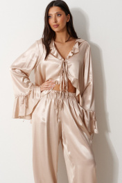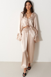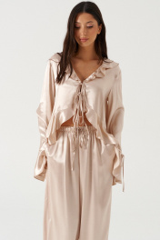 Блуза свободного кроя, выполнена из мягкого струящейся ткани телесного цвета. Характеристика: вырез горловины V-образный, с воланом по всей длине (переходит на спинку), центарльная застежка на завязки, рукав втачной, спущенный, по низу волан с кулиской, низ блузы по переду фигурный, с воланом переходящим на спинку. Длина рукава от линии края горловины 84 см. Длина по центру спинки 71 см