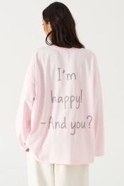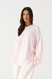 Джемпер прямого свободного кроя,выполнен из трикотажного полотна розового цвета. Характеристики: прямой крой, овальный вырез горловины, горловины из довяза, спинка цельнокроеная, Ппринт "I