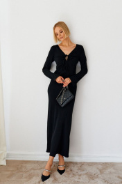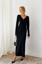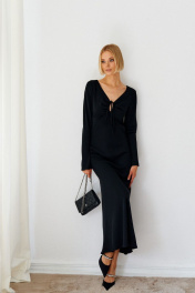 Стильное платье прилегающего силуэта выполнено из полотна черного цвета. Элегантный стильный образ для значимого мероприятия. Характеристики: V образный вырез горловины с декоративным разрезом на кулиске, отрезное выше линии талии, отрез фигурный, спинка - V образный вырез , рукав втачной. Длина изделия 139 см, длина рукава 70 см.