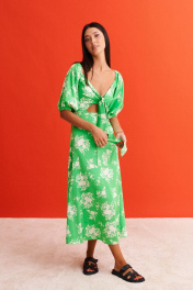 Платье полуприлегающего силуэта, с декоративным вырезом по переду, выполнено из плательной ткани с абстрактным цветочным принтом. Характеристики: полуприлегающий силуэт, V образный вырез горловины , по переду изделия разрез скрытый под съёмным декоративным элементом который выполнен из ткани основного изделия, верх и низ рукава на резинке, застежка потайная тесьма молния в среднем шве заднего полотна изделия, низ изделия на подкладке. Длина по спинке длина 114, длина рукава 37 см.