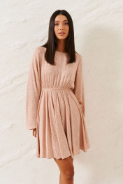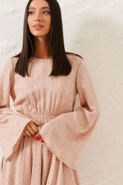 Миниатюрное платье полуприлегающего силуэта выполнено из плательной ткани. Характеристики: полуприлегающий силуэт, подкладка, овальная горловина, отрезное, отрез на резин, рукав втачной с разведением, застежка петля пуговичка по спинке изделия. Длина 89 см, длина рукава 66 см.