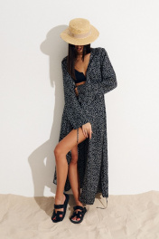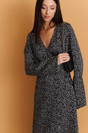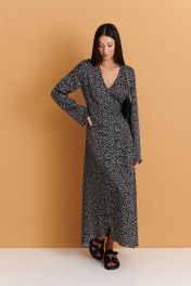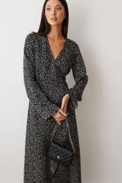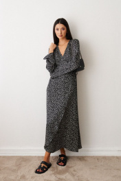 Платье полуприлегающего силуэта на запах выполнено из полотна черного цвета с цветочным принтом - миниатюрные абстрактные цветы белого цвета. Характеристики: полуприлегающий силуэт, V образный вырез горловины, на запах, запах на завязках, завязки выполнены из ткани основного изделия. Рукав втачной. Длина по спинке 133 см длина рукава 66 см.
