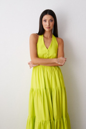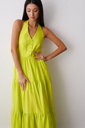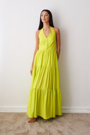Сарафан с открытыми плечами и спинкой выполнен из яркого насыщенного полотна. Характеристики: полуприлегающий силуэт, отрезной, фигурный вырез горловины, застежка центральная на петли - пуговички, пуговички декорированы тканью основного изделия, застежка - потайная тесьма молния по среднему шву заднего полотна изделия, низ свободного кроя на подкладке, выполнен тремя ярусами разной ширины. Длина от верхнего края изделия 152 см.