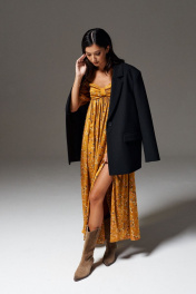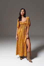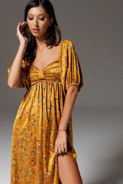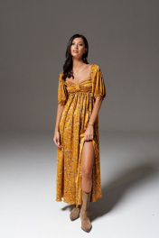 Платье полуприлегающего силуэта выполнено из полотна цвета медь с принтом полевые цветы. Характеристики: полуприлегающий силуэт, отрезное выше талии, фигурный вырез горловины, по переду в области груди декоративная не съёмная деталь, низ и верх рукава на резинка, застежка потайная тесьма молния в среднем шве заднего полотна изделия, юбка в изделии свободного кроя с разрезом (разрез 34 см). Длина по спинке от верхнего края рукава 133 см, длина рукава 63 см.