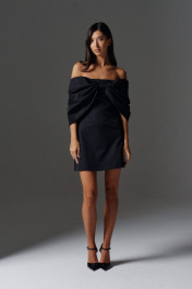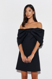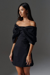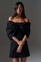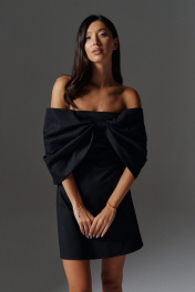 Роскошное платье полуприлегающего силуэта с акцентам бантом выполнено из плательной ткани черного цвета. Характеристики: полуприлегающий силуэт, отрезное, подкладка, прямой вырез горловины, вырез горловины симметричный вырезу по спинке, застежка потайная тесьма молния в среднем шве заднего полотна изделия, по переду платья нашит роскошный крупный не съёмный бант, бант заканчивается по заднему полотну изделия. Длина по спинке 63 см.
