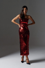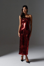 Платье прилегающего силуэта с открытыми плечами выполнено из полотна с пайетками. Характеристики: прилегающий силуэт, подкладка, открытые плечи, верх изделия на резинке. В среднем шве заднего полотна изделия разрез 48 см. Длина изделия 112 см.