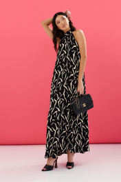 Платье полуприлегающего силуэта выполнено из черного полотна с контрастным принтом. Характеристики: полуприлегающий А-образный силуэт, подкладка, горловина стойка, широкая пройма, застежка потайная тесьма молния в среднем шве заднего полотна изделия.