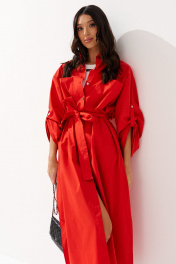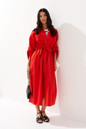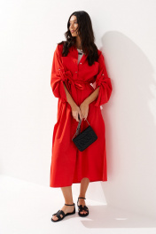 Платье прямого свободного кроя выполнено из полотна красного цвета. Характеристики: отложной воротник, застежка центральная на петли пуговицы, по линии талии нашиты шлевки, в комплекте пояс из ткани основного изделия, по переду крупные накладные карманы, рукав спущен, по рукаву нашит элемент для удержания рукава при сборке, в боковых швах разрезы (54 см), спинка отрезная с декоративной сборкой. Длина по спинке 122 см, длина рукава от края горловины 79 см.