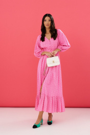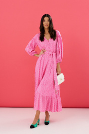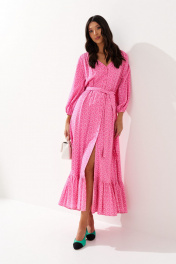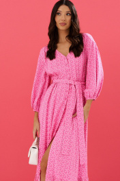 Платье полуприлегающего силуэта выполнено из розового полотна с цветочным принтом. Характеристики: полуприлегающий силуэт, отрезное, отрез на резинке, застежка центральная на петли пуговички, пуговички декорированы тканью основного изделия, по линии отреза нашиты шлевки, в комплекте пояс из ткани основного изделия, низ юбки свободного кроя на подкладке , по низу нашит волан. Длина 132 см, длина рукава 50 см.