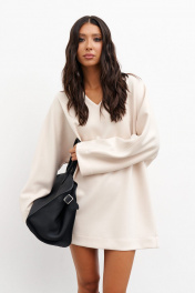 Платье прямого свободного кроя с цельнокроенным рукавом выполнено из ткани бежевого цвета. Характеристики: прямой крой, V образный вырез горловины, рукав свободного кроя цельнокроенный, по спинке средний шов, по низу изделия отделочная строчка. Длина по спинке 77 см, длина рукава от края горловины 74 см.