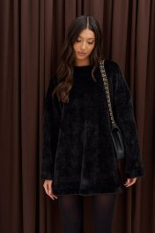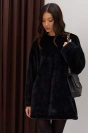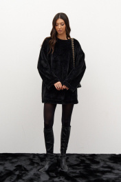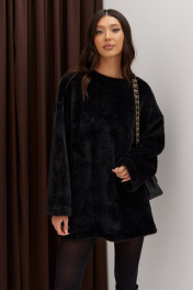 Платье прямого свободного кроя, выполнен из мягкого фактурного полотна черного цвета. Характеристики: прямой крой, овальный вырез горловины, спинка цельнокроеная. Рукав спущен. Длина по спинке 78 см, длина рукава от края горловины 73 см.